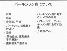 勉強会の内容は、パーキンソン病の症状、評価、治療についてです。当院デイケア、デイサービスでもパーキンソン病の利用者様は多く、各々のスタッフが病態の理解を深め、利用者様に対応していくことが必要です。