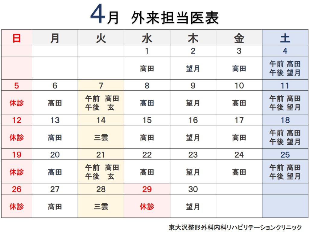 4/7(火) 午前 髙田Dr / 午後 玄Dr(整形外科のみ)